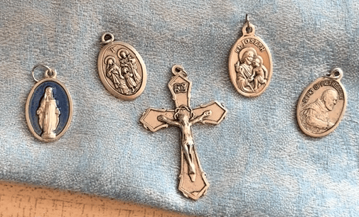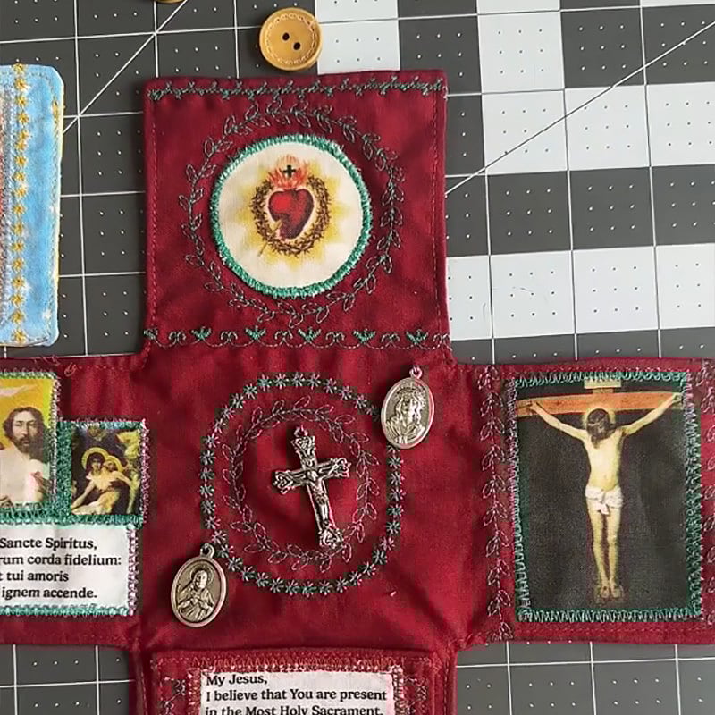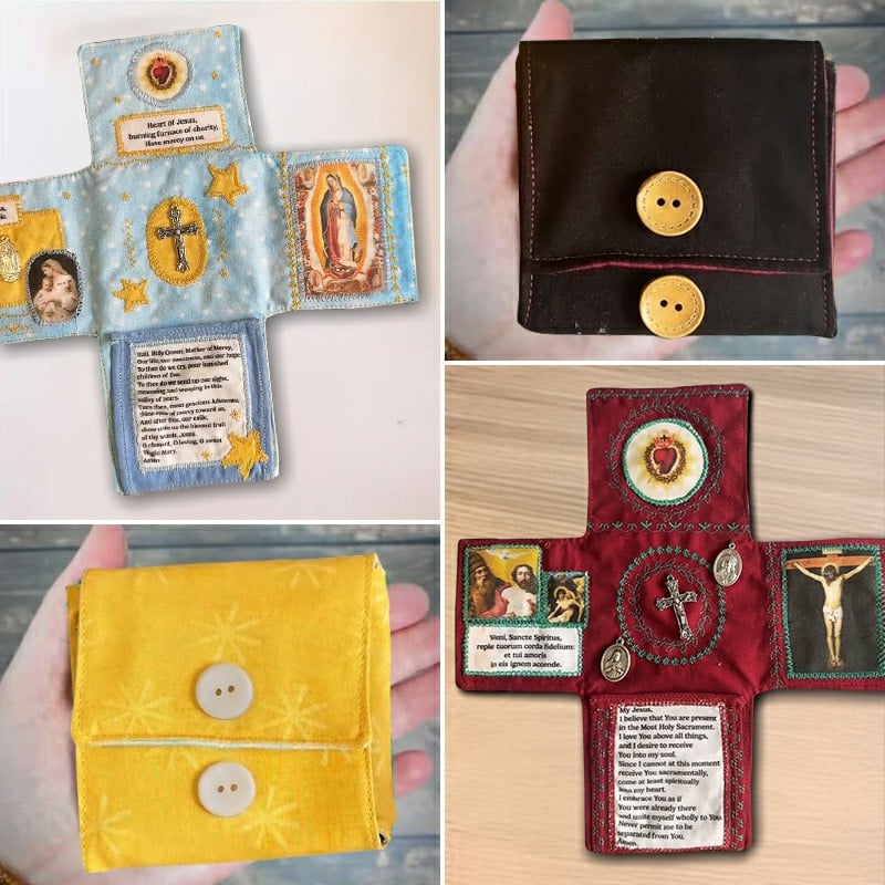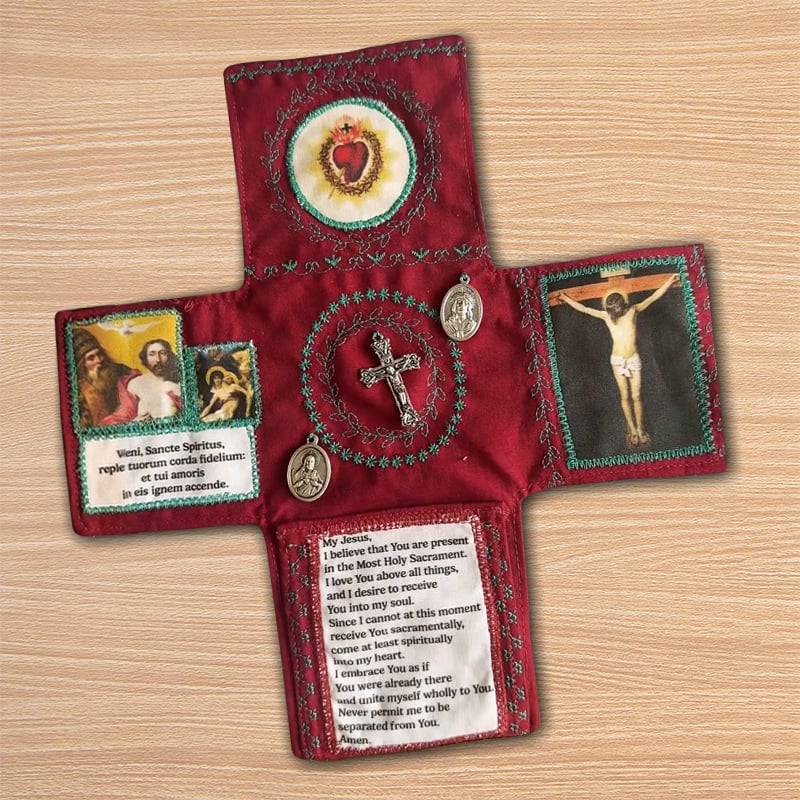 "My Jesus, I believe that You are present in the Holy Spirit. I love You more than anything, and I long to receive You into my soul..."  "Hail, holy Queen, Mother of mercy, our life, our sweetness and our hope. To thee do we cry, poor banished children of Eve: to thee do we send up our sighs, mourning and weeping in this vale of tears.."  🙏 “Pocket Shrine with Cross Inside – A Sacred Companion of Faith” ✨ In a quiet moment of prayer, I stitched this pocket shrine—each thread a whisper of devotion, each charm a reflection of Christ’s love. The silver cross at its heart symbolizes His eternal sacrifice, carried close to bring peace, strength, and sacred comfort wherever you go. ✝️  Each of our shrines is blessed by a priest who takes a bottle of holy water, sprinkles it gently, and blesses it with the words. “Let it be a vessel of faith, O Lord, and a reminder of Thy eternal presence.” May it give comfort in times of doubt, strength in times of weakness, and never wavering peace to every heart it touches.  Carry this Pocket Shrine as a tangible reminder of your faith and devotion. ✝️  Handcrafted with love and adorned with sacred symbols, it serves as a spiritual refuge, bringing comfort and strength wherever you go.   Perfect for personal devotion, travel, or as a heartfelt gift for those who cherish their faith. 🙏💖 - Handmade Pocket Shrine