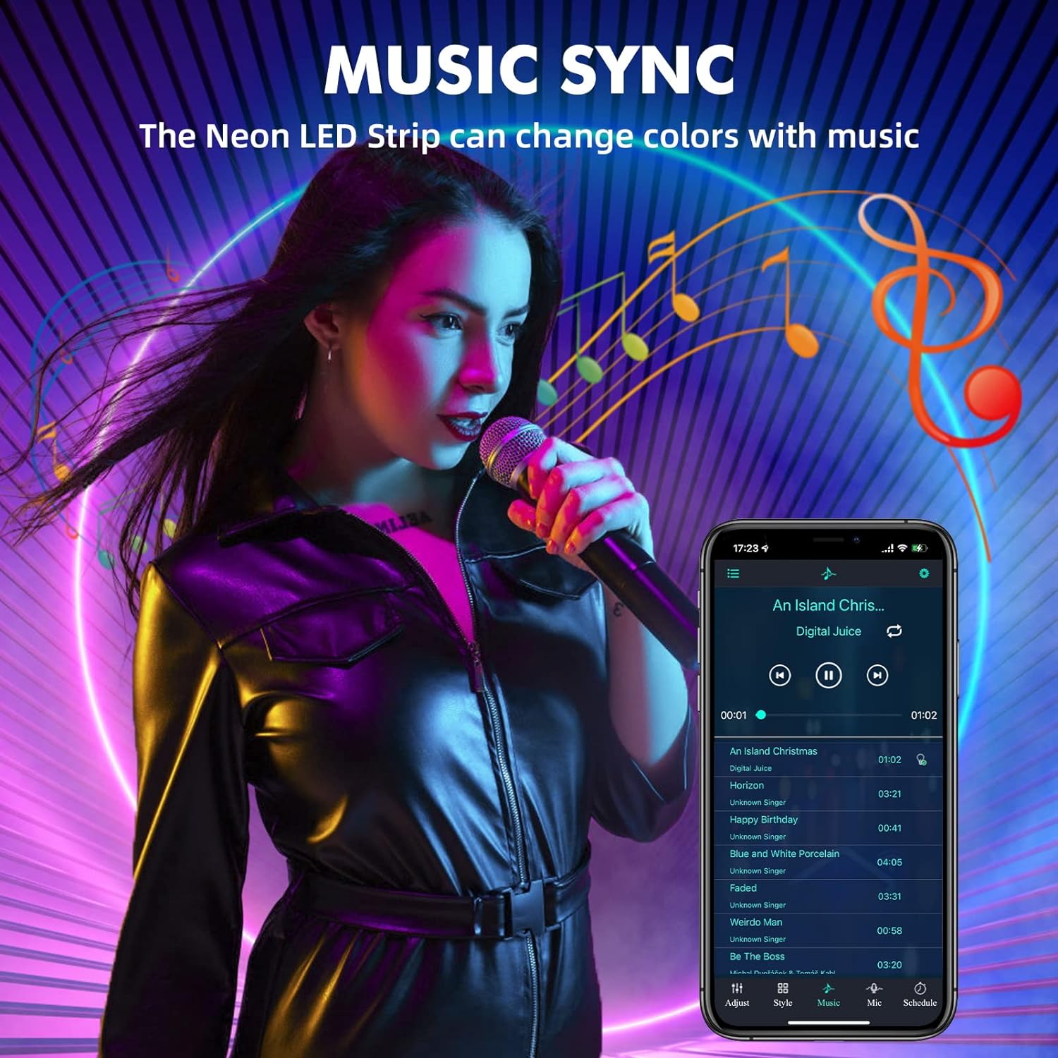 🌟【Music Sync and Timing Mode】The neon LED strip can dance to the rhythm of music in music mode, which is very suitable for festivals or parties. And the time can be set to turn on/off the LED strip in time, which can be used as a light alarm clock.